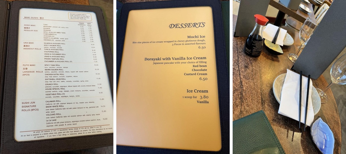 The sushi quality vs price was good! Two people, we paid £50 The selection is varied enough to hit the sweet-spot of everyone’s taste. The wait wasn’t massive, the waitresses were really nice so nothing to point out other than: We made a reservation for the evening and we arrived with two 2-people empty tables and the receptionist still insisted on putting us at the bar, we had to decline of course. They put us at the table in the end, but not great! Would have been 5 stars service if not for that.